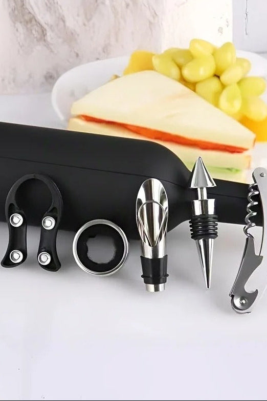 The elegant 5-in-1 set turns gifting and entertaining into an experience. Hidden inside its sleek silhouette are premium stainless-steel essentials — ready for effortless opening, perfect pours, and lasting impressions.